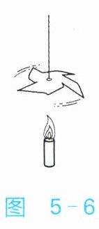 2. 如图5-6所示,点燃蜡烛会使它上方的扇叶旋转起来。这是因为蜡烛的火焰使附近空气的温度升高,体积膨胀,空气的密度变