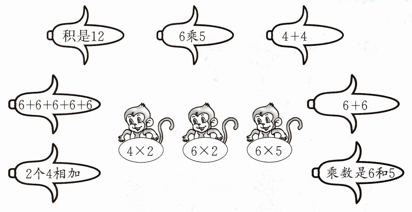 积是12连$6×2$;6乘5连$6×5$;$4 + 4$连$4×2$;$6+6+6+6+6$连$6×5$;2个4相加连$4×2$;乘数是6和5连$6×5$;$6 + 6$连$6×2$。