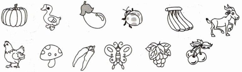 1. 把果蔬用“○”圈出来,动物用“□”圈出来。