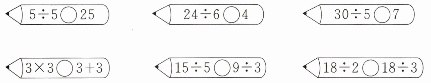 6. $18÷2 = 9$,$18÷3 = 6$,因为$9\gt6$,所以$18÷2\gt18÷3$。