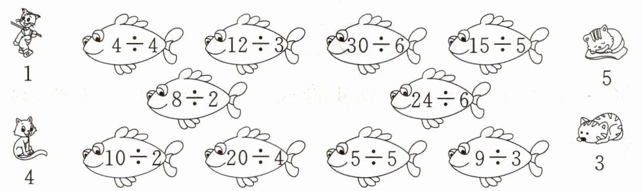 从左到右,从上到下依次连为:$4÷4$与$1$相连;$12÷3$、$8÷2$、$24÷6$都与$4$相连;$30÷6$、$10÷2$、$20÷4$都与$5$相连;$15÷5$、$9÷3$都与$3$相连;$5÷5$与$1$相连 。