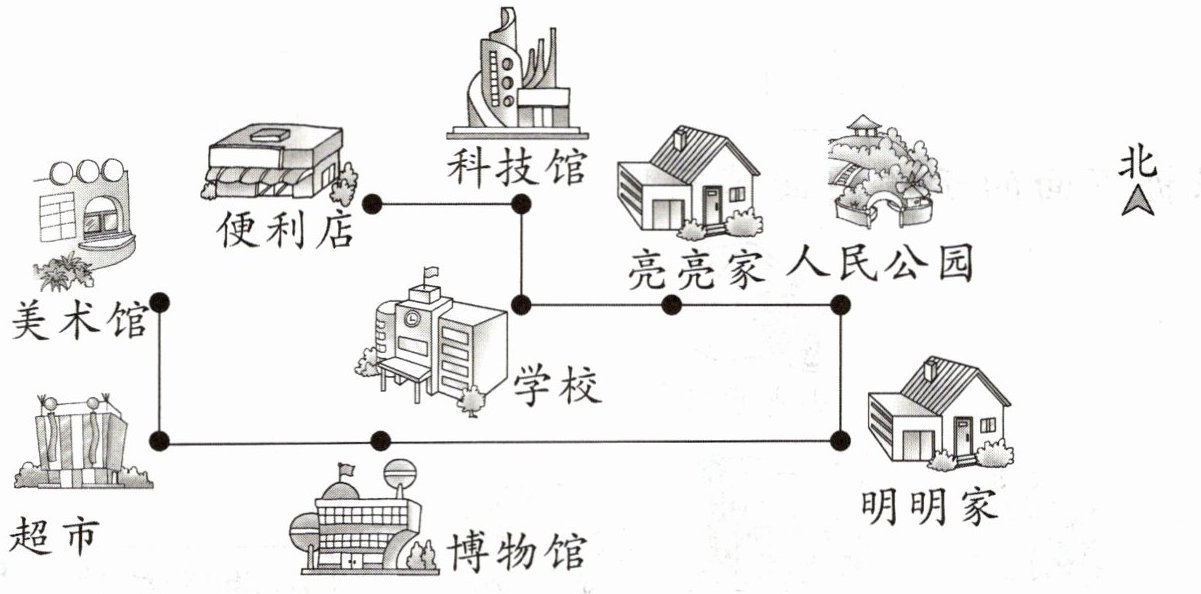 (2)亮亮在人民公园晨练完后向( )面走,途经明明家,约上明明后一起向( )面走,先经过( ),再经过( ),最后向( )面走到美术馆。