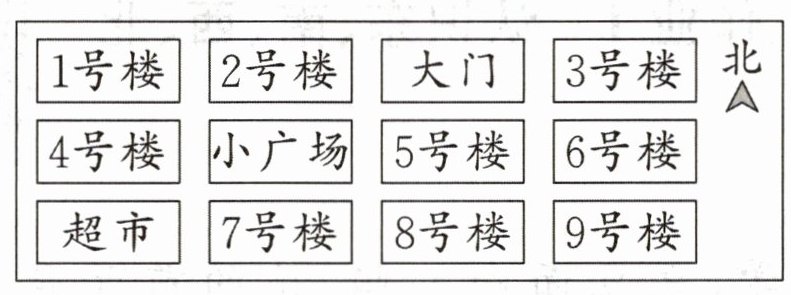 (1)超市在4号楼的( )面,2号楼在小广场的( )面。