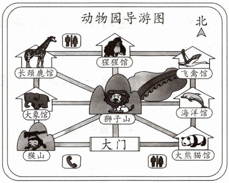 2. 小玲和小红正在动物园大门口看导游图。她们想要先去看猴子,从大门向( )面走,到达猴山;然后她们想去看大象,再从猴山向( )面走,到达大象馆;接着向( )面走,到达狮子山。