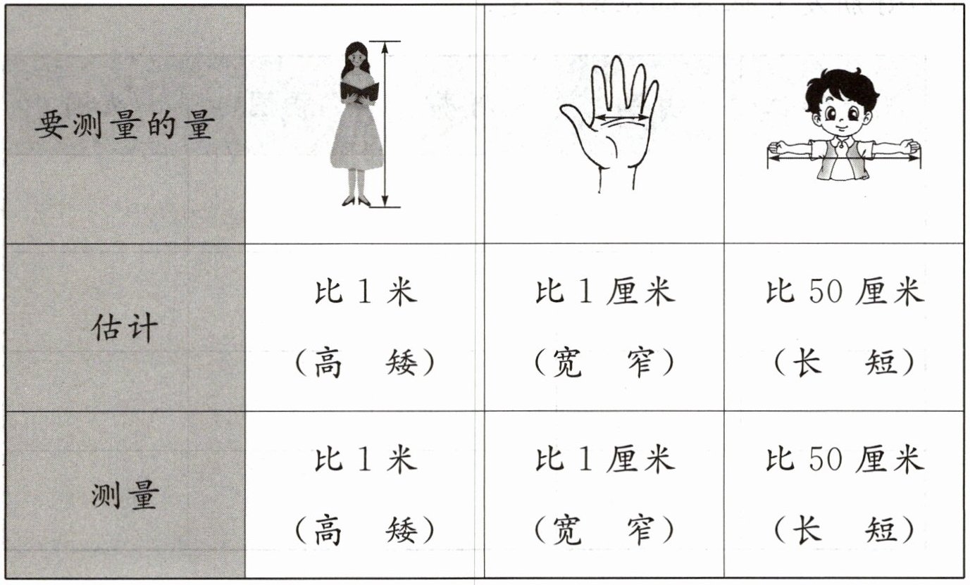 | 测量 | 比 1 米(高 矮) | 比 1 厘米(宽 窄) | 比 50 厘米(长 短) |
