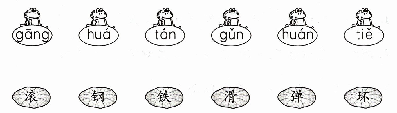从左到右依次将上方拼音与下方对应的汉字相连,即“gāng”连“钢”;“huá”连“滑”;“tán”连“弹”;“gǔn”连“滚”;“huán”连“环”;“tiě”连“铁”。