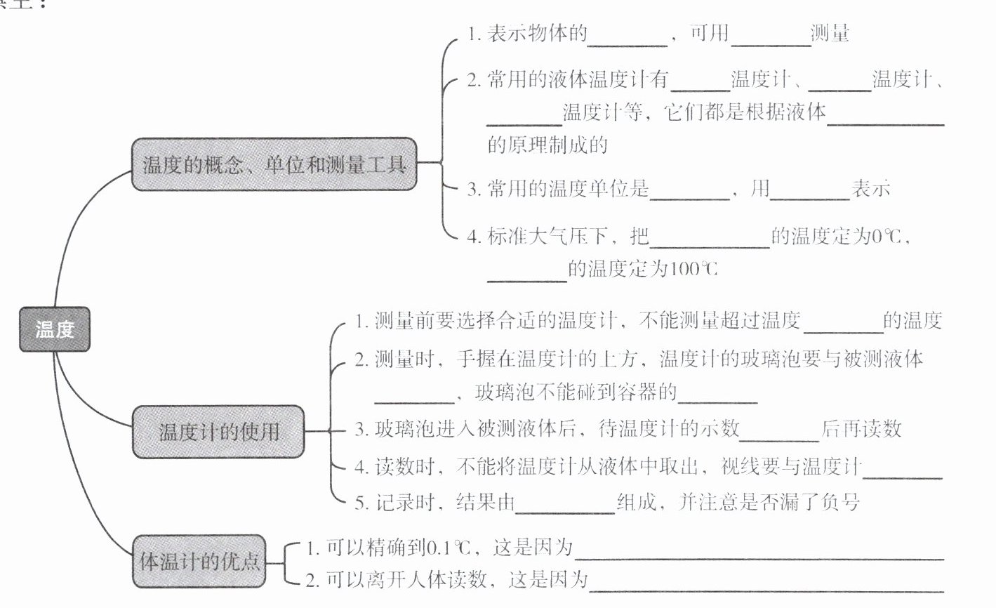 (思维导图内容:温度 -> 温度的概念、单位和测量工具;温度计的使用;体温计的优点。温度的概念、单位和测量工具下:1. 表示物体的