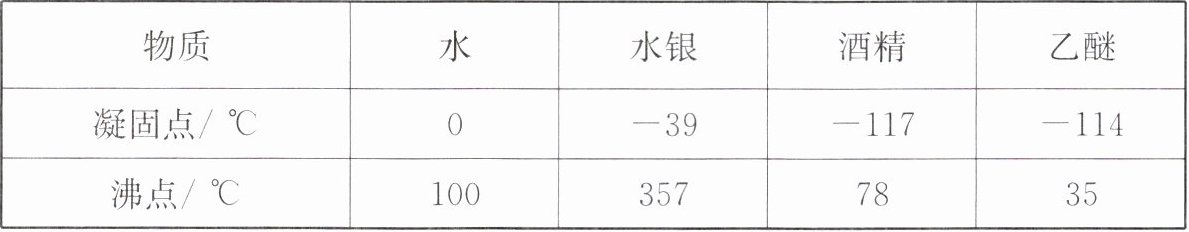 4. 我国夏季最高气温出现在新疆吐鲁番盆地,达49.6℃;冬季最低气温出现在黑龙江漠河,达-53℃。下表为一些物质在标准大气压下的凝固点和沸点,根据下表判断,在我国各个地区都能测量气温的温度计是(