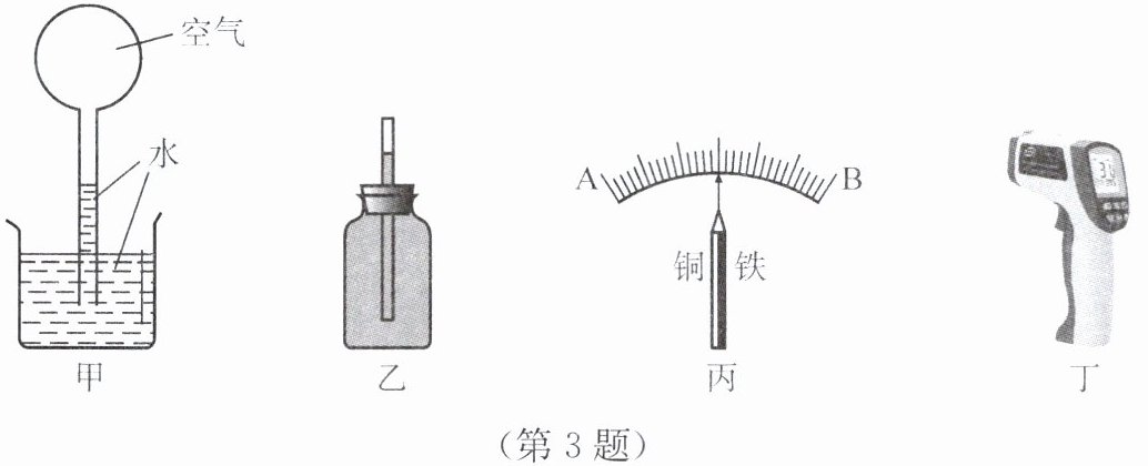 (3)一般物体都有热胀冷缩的性质。在相同的受热条件下,铜的膨胀程度比铁的膨胀程度大。将两块形状、厚度都相同的铜片和铁片铆接在一起就可以制成双金属片温度计,如图丙所示。当气温升高时,指针偏向中央刻度线的