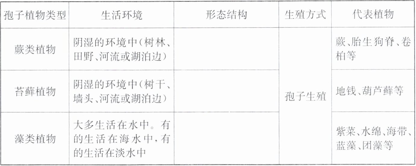 |藻类植物|大多生活在水中。有的生活在海水中,有的生活在淡水中|______|孢子生殖|紫菜、水绵、海带、蓝藻、团藻等|