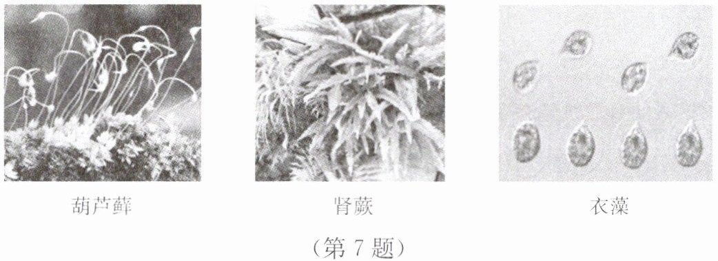 (3)藻类植物、苔藓植物和蕨类植物都不结种子,靠孢子繁殖后代,属于孢子植物。图中衣藻属于藻类植物,葫芦藓属于苔藓植物,肾蕨属于蕨类植物,它们都能用孢子繁殖后代。