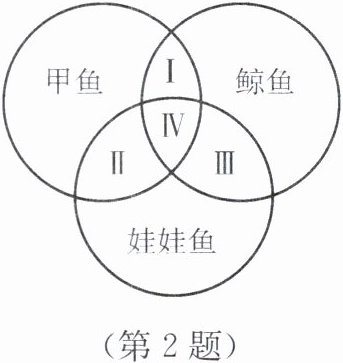 2. 自然界里有许多动物的名称中带“鱼”字,但不一定是鱼类,如甲鱼、鲸鱼、娃娃鱼(大鲵)。小金用图表示这三者的特征关系,并写出Ⅰ区、Ⅱ区、Ⅲ区和Ⅳ区所代表的特征,其中正确的是(