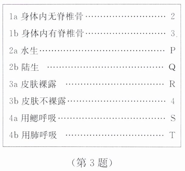 3. 小科在野外观察到五种动物P、Q、R、S、T,于是设计了如图所示的二歧分类检索表来分辨它们。下列有关叙述正确的是(