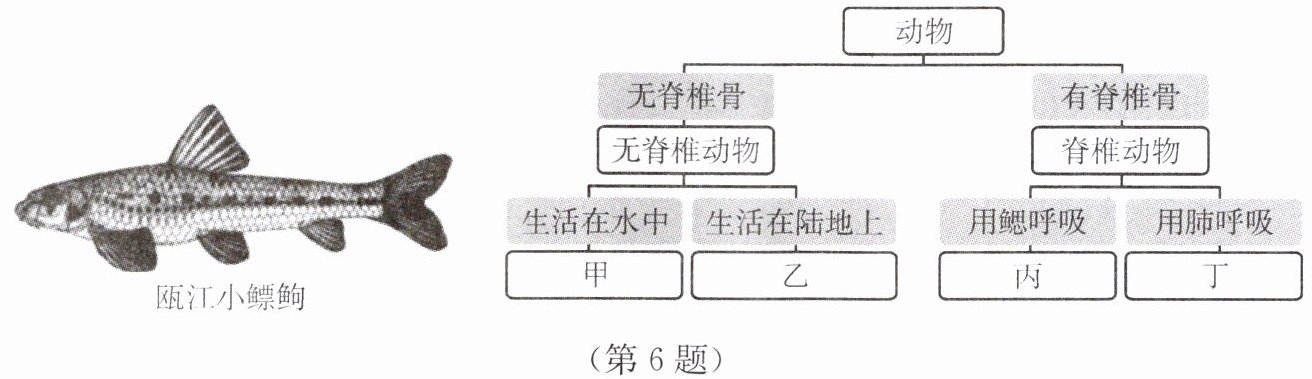 甲是无脊椎动物且生活在水中,乙是无脊椎动物且生活在陆地上,丁是有脊椎动物且用肺呼吸,均不符合瓯江小鳔鮈的特征。