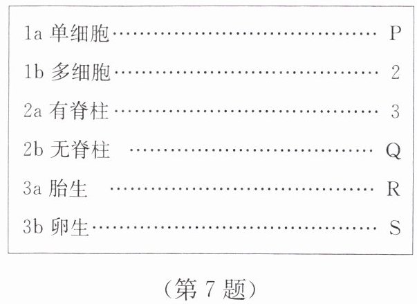 蜜蜂是多细胞生物且无脊柱,根据“1b 多细胞 ………… 2”和“2b 无脊柱 ………… Q”,可知蜜蜂对应字母Q。