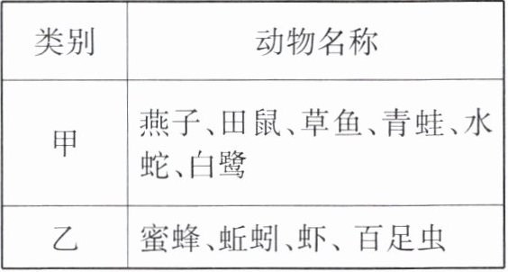 (2)甲类动物中燕子、田鼠、白鹭等属于脊椎动物,乙类动物中蜜蜂、蚯蚓、虾等属于无脊椎动物,分类依据是有无脊柱。