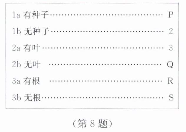 (3)小明在湿地内采集了四种植物P、Q、R和S,设计了如图所示的二歧分类检索表来分辨这些植物。这些植物中有一种是蕨类植物,它是______