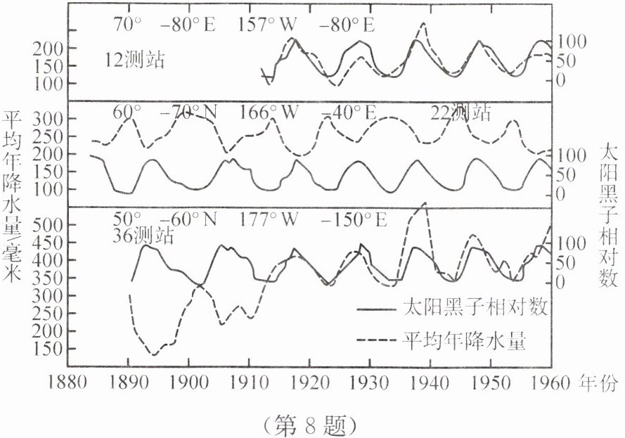 8. 读太阳黑子与平均年降水量的相关性图,回答下列问题: