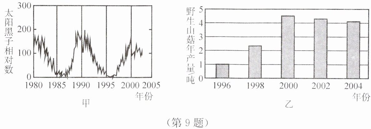 9. 太阳黑子的多少和大小,往往作为太阳活动强弱的标志。某研究人员以当地每年相同区域内的野生山菇为例,对太阳黑子与农作物的关系进行研究,数据处理结果如图所示。请回答下列问题: