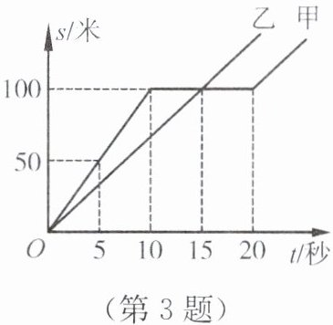 $v_{甲}=\frac{s_{甲}}{t}=\frac{50米}{10秒}=5米/秒$,$v_{乙}=\frac{s_{乙}}{t}=\frac{100米}{10秒}=10米/秒$,$v_{甲}<v_{乙}$,A正确。