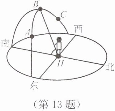 13. 如图所示为某日太阳的东升西落(A、B、C分别表示不同时间太阳的位置),读图并回答下列问题: