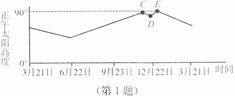 从图中可以看出,该地在3月21日左右(春分日)正午太阳高度相对较大,之后逐渐减小,到6月22日左右(夏至日)达到一个相对较小的值,然后又开始增大,在12月22日左右(冬至日)前后达到最大值$90^\circ$。