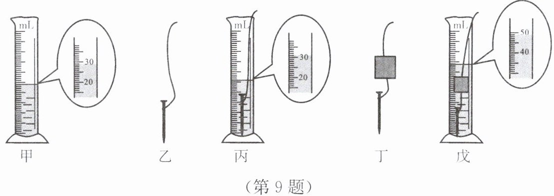 9. 为了测量漂浮在水面上的蜡块体积,小明想出了如图所示的测量方法。