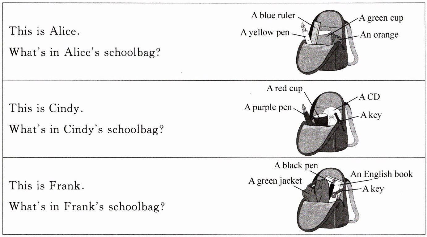 | This is Frank. What’s in Frank’s schoolbag? | A black pen, A green jacket, An English book, A key |