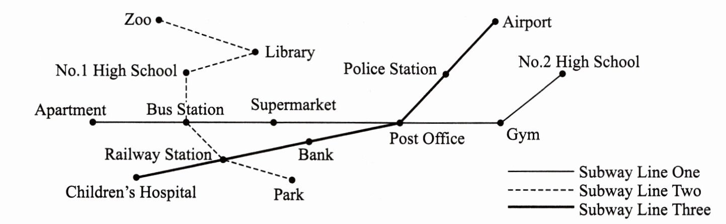 53. Li Lei wants to go to Children's Hospital from No.1 High School. He takes Subway Line Two, and changes(转乘) to Subway Line Three at