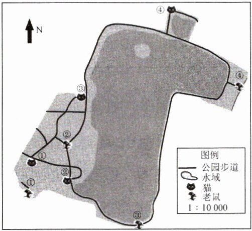 背景材料 “公园躲猫猫”是一种正在年轻人生活中“出圈”的户外追逐跑步主题游戏。该游戏使用手机电子地图共享位置模拟猫捉老鼠,以公园跑步运动为基础,在设计上创造性地融合密室逃脱、剧本杀等元素,使跑步更具趣味性与社交属性。右图示武汉某次“公园躲猫猫”游戏中猫和老鼠的位置。