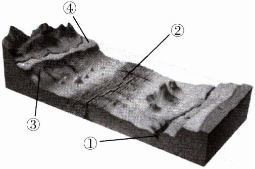 (3)图中标注说明:①海沟 ②大陆坡 ③洋盆 ④洋中脊 ④ ① ③