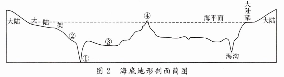(3)读图2,请在图中写出序号所表示的海底地形名称。材料二中提到的海底“山脉”“峡谷”和“平原”分别对应图中的______、______、______(写序号)。