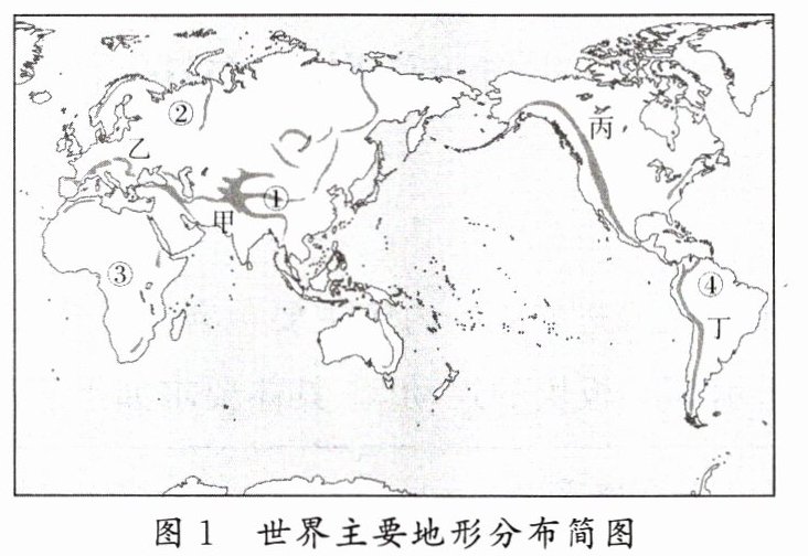 (1)读图1,图中甲、乙、丙、丁分别表示世界主要山脉。甲是______山脉,它是世界海拔______的山脉;乙是______山脉,位于______洲南部;丙______(写山脉名称)与丁______(写山脉名称)共同组成了纵贯______洲和______洲的科迪勒拉山系。