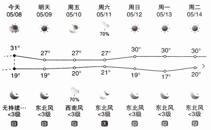 小明常关注天气预报,右边是他查到的武汉近期天气预报图。
