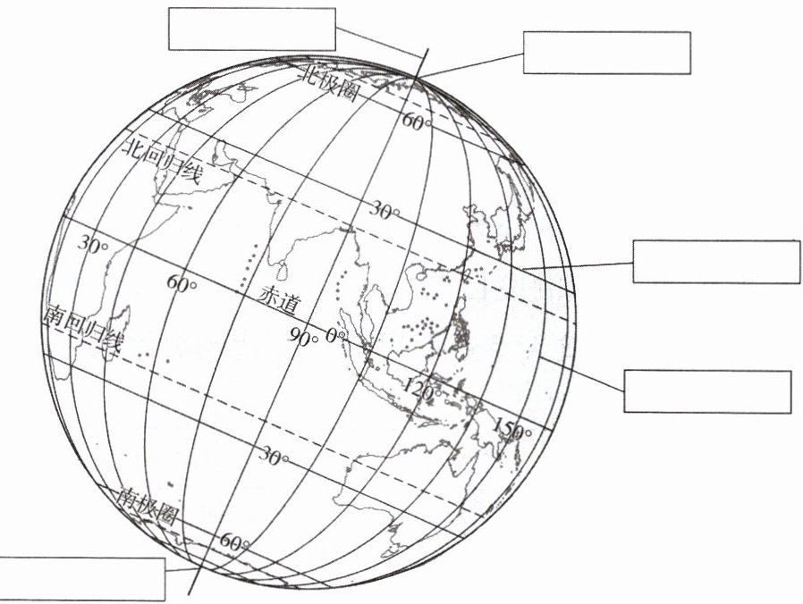 1. 了解地球仪——在图中填写北极、南极、地轴、经线、纬线。