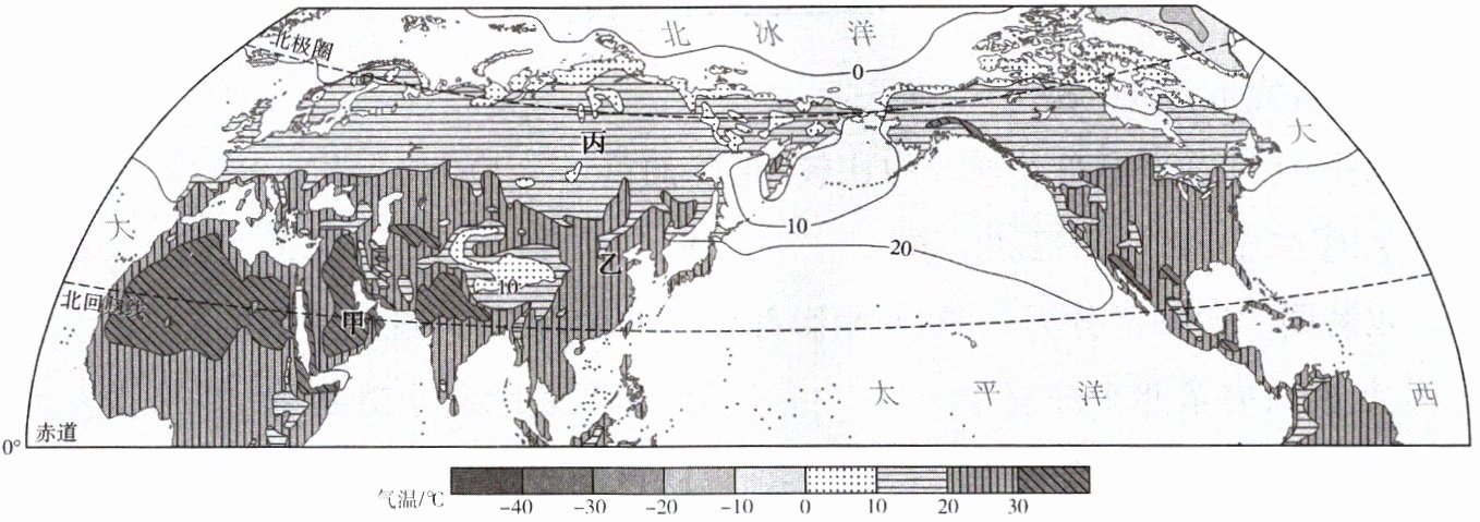 2.甲、乙、丙三地,体现了气温大致由______纬向______纬逐渐降低的分布规律。