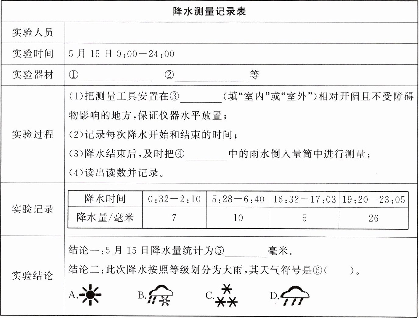 |实验结论|结论一:5月15日降水量统计为⑤______毫米。结论二:此次降水按照等级划分为大雨,其天气符号是⑥( )。A. ☀️ B. 🌧️ C. ❄️ D. 🌧️|