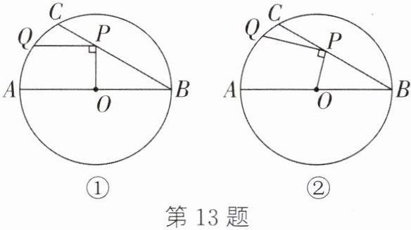 13. 在$\odot O$中,直径$AB= 6$,BC 是弦,$\angle ABC= 30^{\circ}$,点 P 在 BC 上,点 Q 在$\odot O$上,且$OP\perp PQ$.