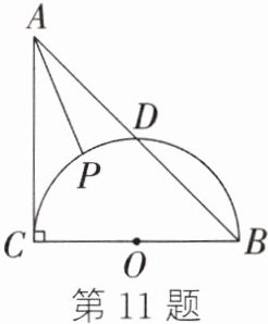 11. 如图,在$Rt\triangle ABC$中,$\angle ACB= 90^{\circ}$,$AC= BC= 2$.以 BC 的长为直径的半圆 O 交 AB 于点 D,P 是$\overset{\frown}{CD}$上的一个动点,连接 AP,则 AP 长的最小值为______.