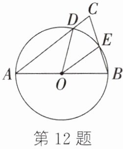 12. 如图,在$\triangle ABC$中,以 AB 为直径的$\odot O$交 AC 于点 D,交 BC 于点 E,连接 OD,OE.若$\angle C= 70^{\circ}$,求$\angle DOE$的度数.