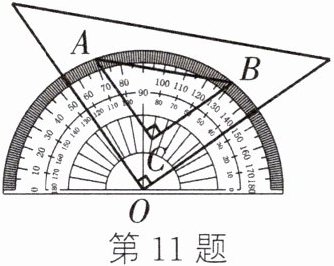11. (2023·温岭一模)将等腰直角三角尺与量角器按如图所示的方式摆放,使三角尺的直角顶点与量角器的中心O重合,三角尺内部的小等腰直角三角形的两个顶点A,B恰好落在量角器的边缘,对应的刻度分别是70°,130°. 若AC= 5,则$\overset{\frown}{AB}$与AB所围图形的面积为______.