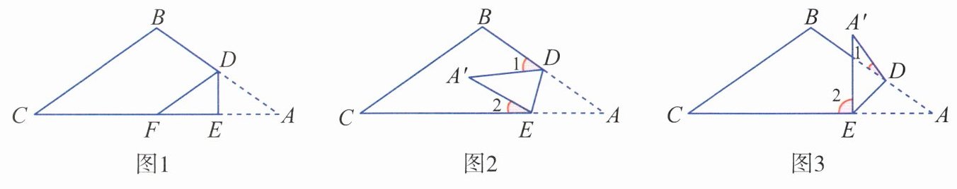 (1)把△ABC纸片按如图1所示折叠,使点A落在AC边上的点F处,DE是折痕,求证:BC//DF。