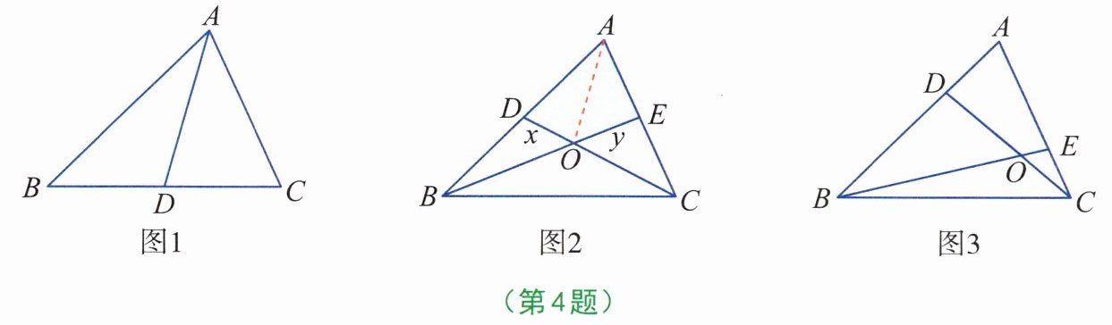 ∴$S_{△CEO}=\frac{1}{2}S_{△AEO}。$设S_{△ADO}=x,S_{△CEO}=y,则S_{△BDO}=3x,S_{△AEO}=2y,由题意得$S_{△ABE}=\frac{2}{3}S_{△ABC}=40,S_{△ADC}=\frac{1}{4}S_{△ABC}=15。$可列方程组为$\begin{cases} x+3y=15, \\ 4x+2y=40, \end{cases}$解得$\begin{cases} x=9, \\ y=2 \end{cases}。$