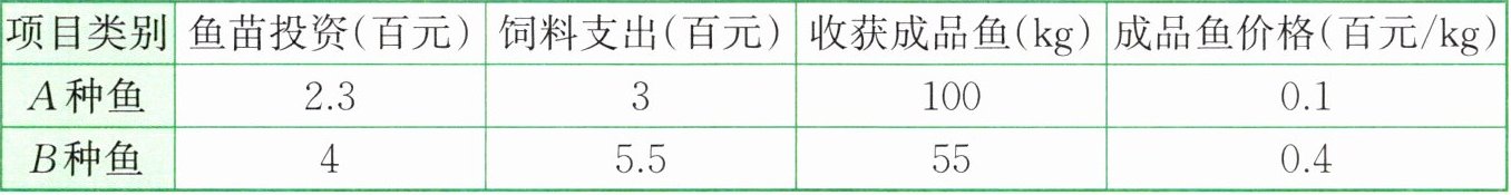 (2)1箱A种鱼的利润$=100×0.1-(2.3 + 3)= 4.7$(百元),1箱B种鱼的利润$=55×0.4-(4 + 5.5)= 12.5$(百元)。