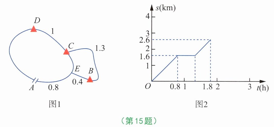15. 某景区的旅游线路如图1,其中$A$为入口,$B,C,D$为风景点,$E$为三岔路的交汇点,图1中所给数据为相应两点间的路程(单位:km)。甲游客以一定的速度沿路线“A→D→C→E→A”步行游览,在每个景点逗留的时间相同,当他回到$A$处时,共用去3h。甲步行的路程$s(km)与游览时间t(h)$之间的部分函数图象如图2。