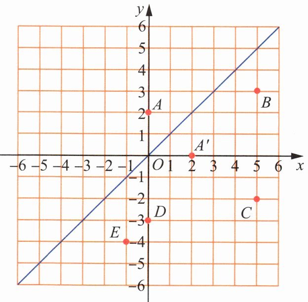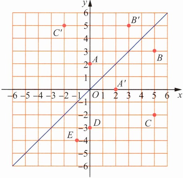 (1)实验与探究:由图观察易知$A(0,2)关于直线l的对称点A'的坐标为(2,0)$,请在图中分别标明$B(5,3)$,$C(5,-2)关于直线l的对称点B'$,$C'$的位置,并写出它们的坐标:$B'$______,$C'$______。