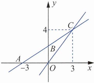 例5 如图,在平面直角坐标系$xOy$中,一次函数$y= k_1x+b的图象与x轴交于点A(-3,0)$,与$y轴交于点B$,且与正比例函数$y= kx的图象交点为C(3,4)$。