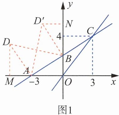 (1)∵正比例函数$y= kx的图象经过点C(3,4)$,∴$4= 3k$,$k= \frac{4}{3}$。