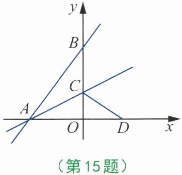 15. 如图,直线$y= \frac{4}{3}x+4与x$轴、$y轴分别交于A,B$两点,点$C在OB$上,若将$\triangle ABC沿AC$折叠,使点$B恰好落在x轴上的点D$处,则点$C$的坐标是______。
