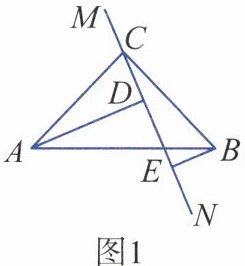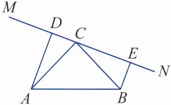 [图形描述:直线MN与AB相交,交点靠近A,D在AC右侧,E在BC左侧]